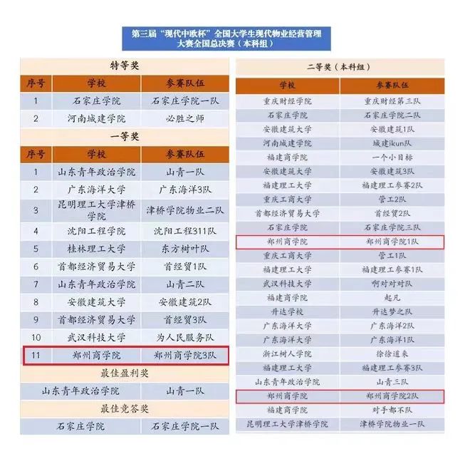 11月4日,我院工程管理、工程造价专业学生参加了第三届“现代中欧杯”全国大学生现代物业经营管理大赛全国总决赛,并且获得一等奖1项、二等奖2项的好成绩。