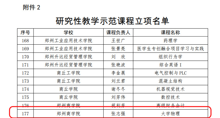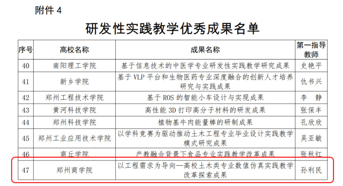 近日,依据河南省教育厅《关于公布2023年度河南省本科高校研究性教学系列项目名单的通知》(教高〔2023〕388号)文件,我院院长孙利民教授的《以工程需求为导向——高校土木类专业数值仿真实践教学改革探索成果》获批“研发性实践教学优秀成果”,张志强副教授的《大学物理》立项“研究性教学示范课程”。