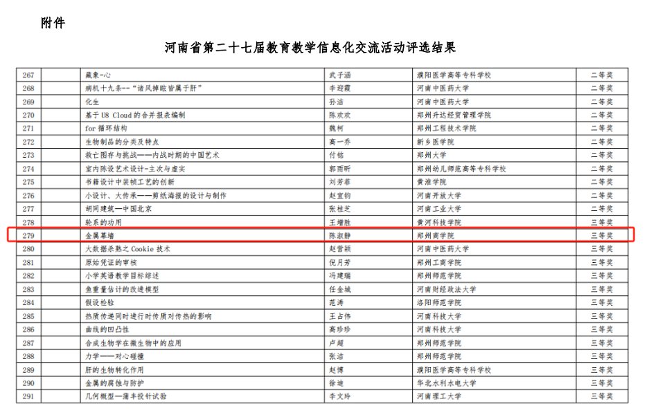 近日,教育厅公布了关于河南省第二十七届教育教学信息化交流活动评选结果,我校多名教师获奖,其中我院陈淑静老师的微课《金属幕墙》获得高等教育组三等奖。