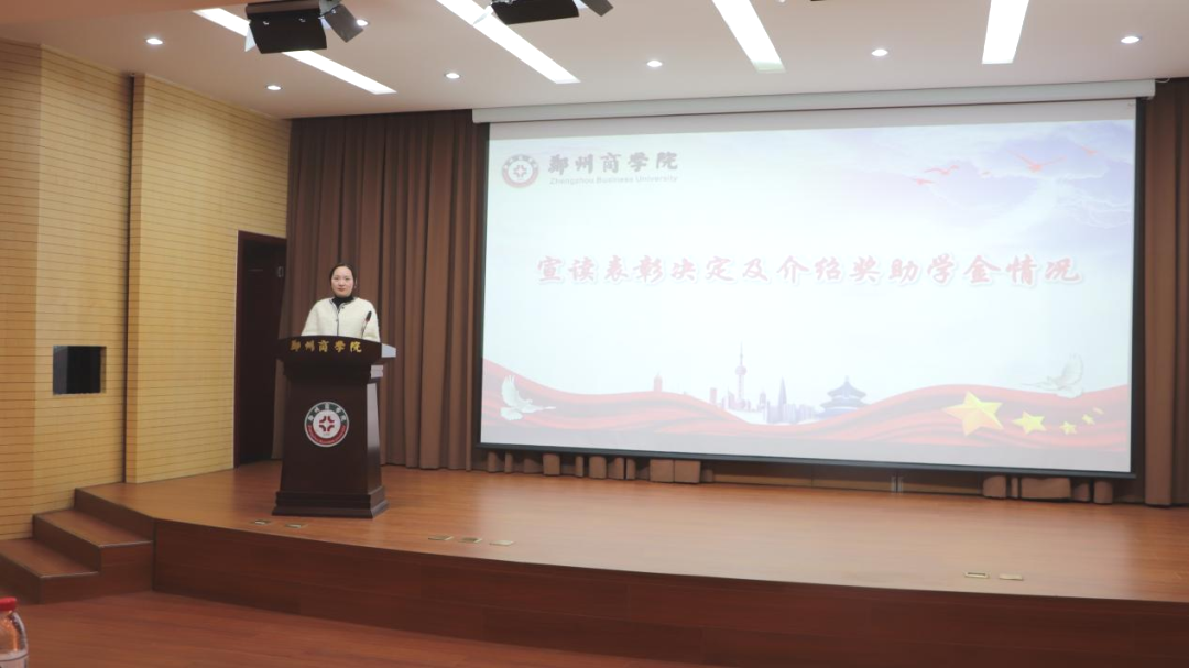 教学秘书郑丹老师宣读《关于表彰2022-2023学年第二学期建筑工程学院奖学金获得者的决定》及介绍我院2023学年国家奖助学金工作情况。