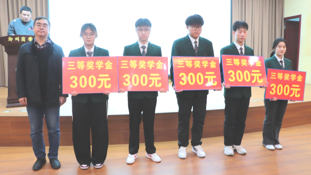 张盼利副教授为成绩优秀奖学金三等奖学生代表颁奖并合影留念。