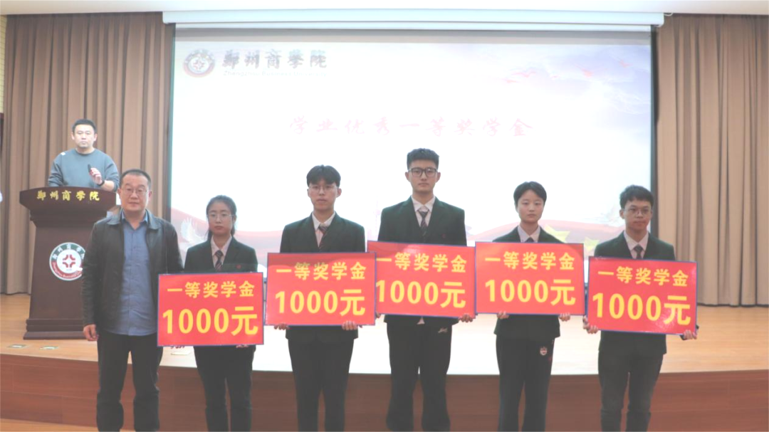 朱宏东书记为成绩优秀奖学金一等奖学生代表颁奖并合影留念。