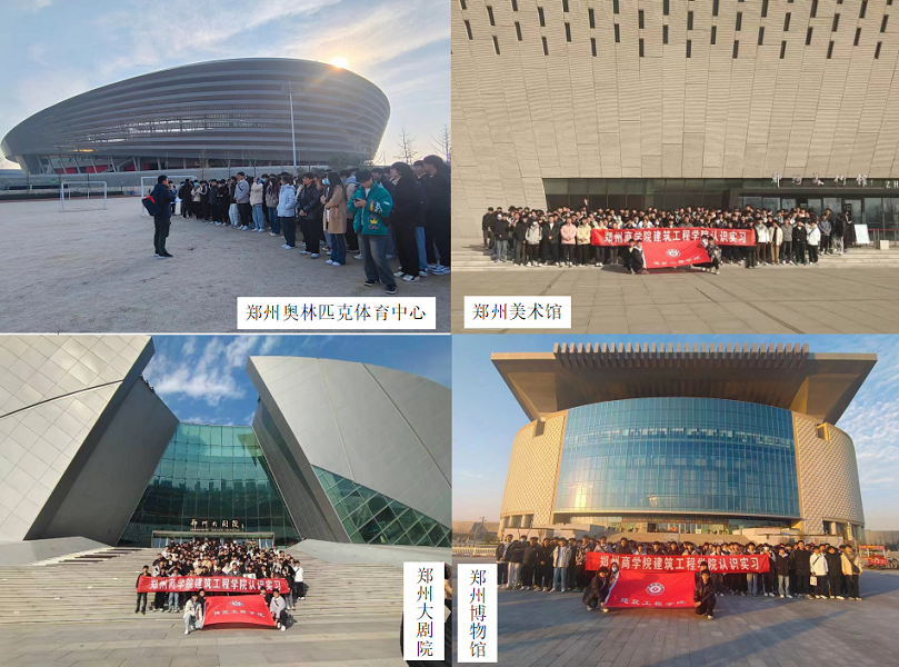 校外实习部分组织学生参观了郑州中央文化区,认识了郑州奥林匹克体育中心、郑州美术馆、郑州博物馆和郑州大剧院的设计理念、外墙装饰选材、特殊施工工艺等方面。讲解之余,让学生到郑州美术馆和博物馆参观学习,沉浸式感受建筑中的文化魅力,不仅能让学生充分认识了建筑物的结构形式、力学性能,同时也让学生领略了河南的人文景观,提升了文化素养。
