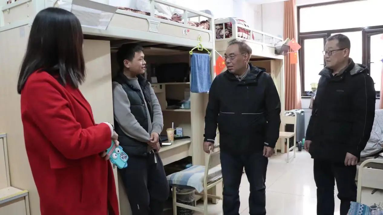 院长孙利民关切询问了同学们的家庭情况、适应程度以及生活学习中所遇到的困难。期间,党委书记朱宏东强调,建工学院将全力为同学们创造一个良好的学习和生活环境,并殷切希望大家能够珍惜在校时光,勤奋学习,全面提升自己。副院长张燕燕勉励同学们要自觉遵守学校的规章制度,树立良好的生活习惯,共同营造一个和谐温馨的宿舍氛围。团委书记刘帅也详细了解了宿舍的管理情况。各位辅导员老师嘱咐同学们保持良好的宿舍卫生和生活习惯,同时要注意用电安全和防范电信网络诈骗,营造安全稳定积极向上良好宿舍氛围。