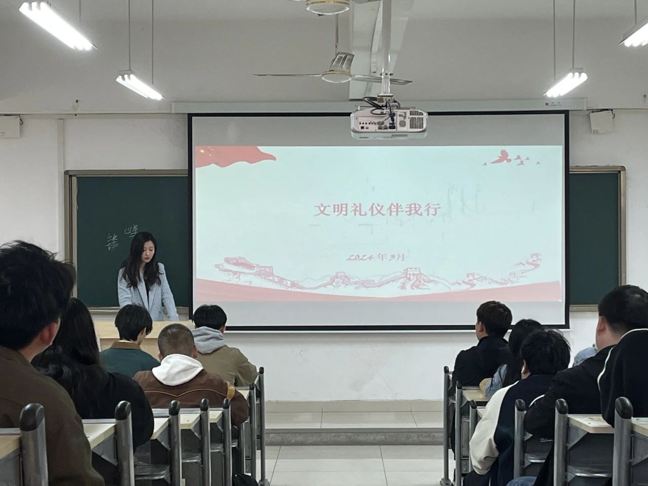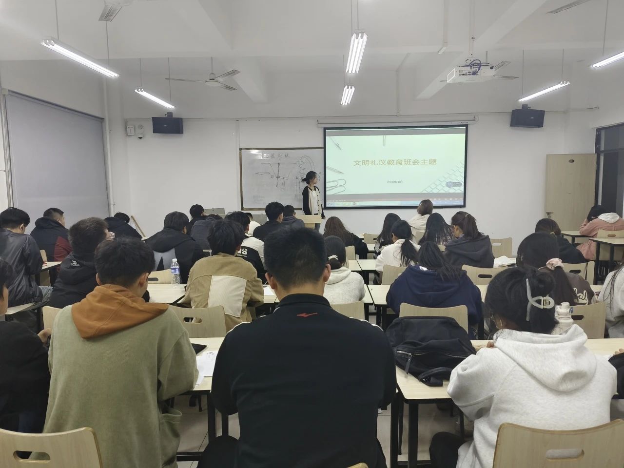 我院各班级收到通知后,陆陆续续开展相关班会。此次班会主要分为四大要点,第一,倡导学生行为得体,培养举止文明。要求师生在公共场合要举止得体,不大声喧哗,爱护公共财务,注意个人举止文明。第二,加强学生养成良好素养,创建文明校园。学生应自觉遵守公共场合的文明公约以及规章制度,不在公共场合吸烟,自觉维护无烟校园环境等相关公共场合的文明举止。第三,强化学风建设,提升课堂文明。学生应自觉遵守学习纪律,尊敬师长,勤奋学习,教学楼内文明礼让,自觉维护教师卫生清洁等。第四,规范个人着装,彰显文明风范。学生在校内不蓬头垢面,不奇装异服,应衣装整洁,大方得体,彰显学生气质。