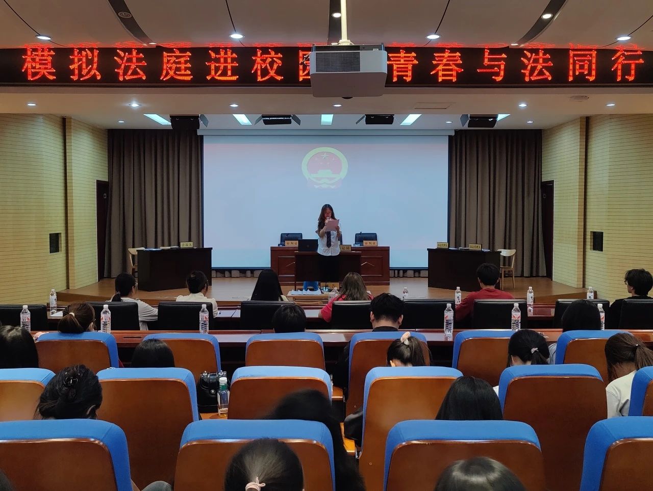本次普法活动以模拟法庭的形式进行,分为六个阶段,首先是开庭,各演职人员上场,由书记员宣读庭审记录以及在庭审过程中的注意事项;接着进入案件调查与辩论阶段,由公诉人陈述案件经过,被告陈述事实,由公诉人提交相关证据,由辩论员为被告辩论,最终结果由审判长定夺;最后宣判结果,审判长对两名被告进行法庭教育。
