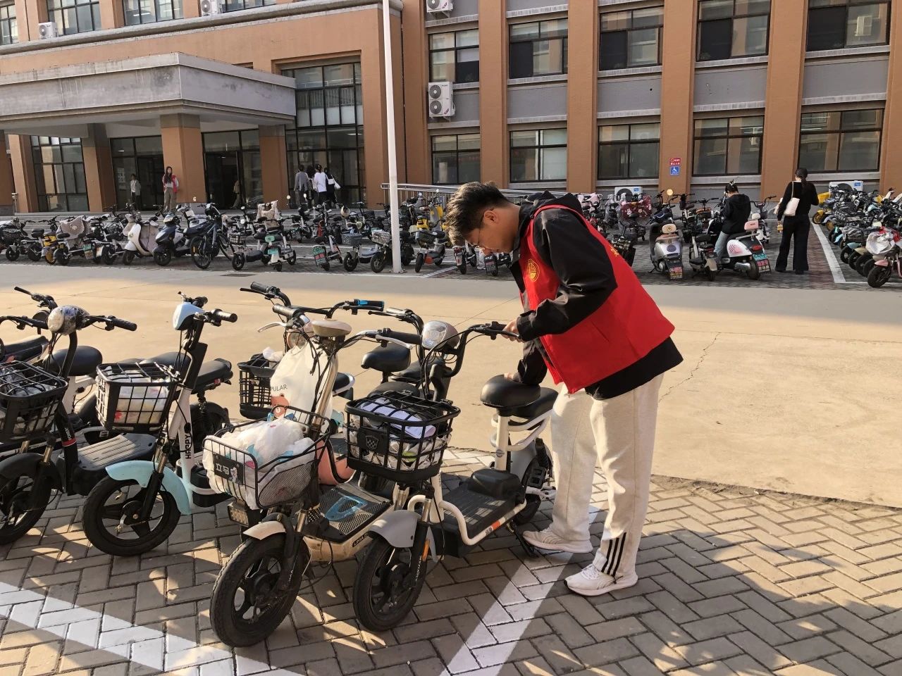 建工学院的志愿者在早上和中午的课前对电动车辆停放进行规范检查,对停放不规范的电动车辆进行挪移和规范停放,确保车辆停放不影响道路交通。与此同时,志愿者们也对带食物进教学楼的行为进行制止并改正,为维护教学楼内干净整洁的环境做出努力。