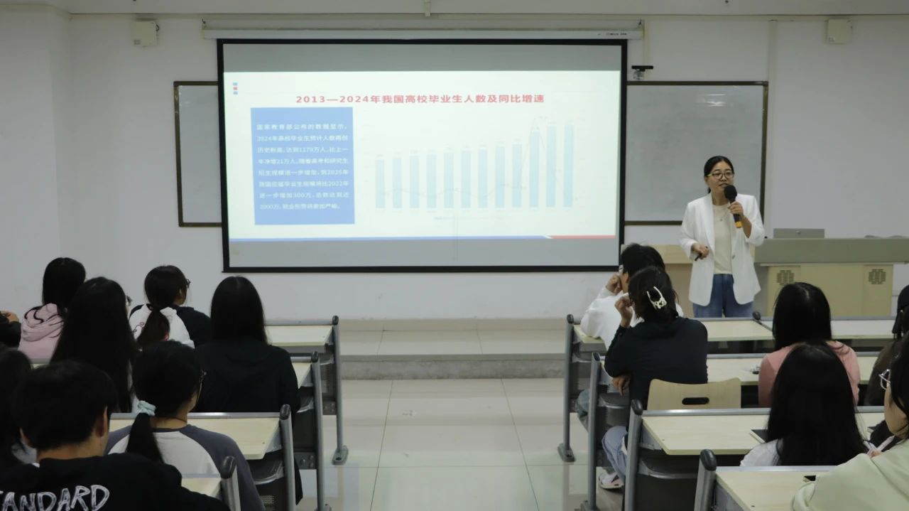 接着与会专业教师申净老师上台发言,从公职就业前景到就业备考政策,多方面为同学们提供更加全面的备考经验,分享丰富的参考书籍和资料,同时分析考公形势,指导学生进行有针对性的备考。