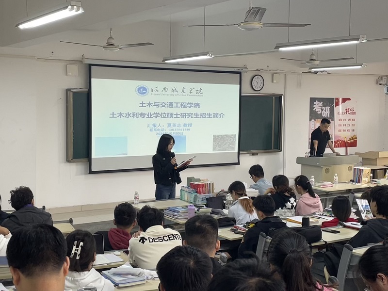 宣讲会主讲人为河南城建学院土木与交通工程学院道路桥梁工程系主任夏英志教授,会议由建筑工程学院副院长叶灵云主持。首先,夏教授对河南城建学院的发展历史、人才队伍、科研平台和特色领域等进行总体介绍;其次,夏教授对河南城建学院研究生招生与培养的情况进行了详细说明;最后,夏教授对研究生奖助体系及招生政策进行了细致解读。与会同学与河南城建学院莅校领导开展了积极的交流和咨询。