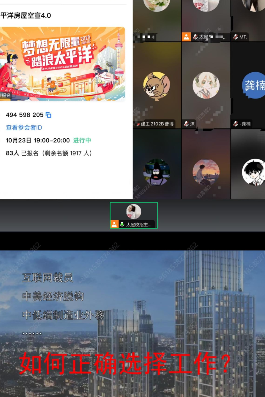 为落实学校未实习就业学生帮扶工作的决策部署,全面推动我院2025届毕业生高质量充分就业,搭建毕业生和用人单位交流平台,为就业工作保驾护航,建筑工程学院于10月23日组织召开太平洋房屋空中宣讲会,2025届就业意向毕业生83名学生参会。