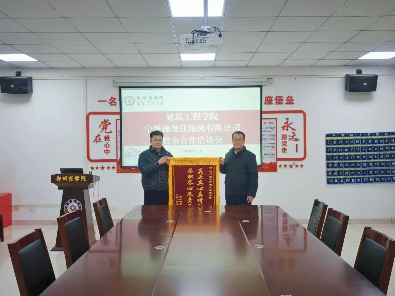 宁波德曼压缩机有限公司人力资源部叶经理对企业理念、经营使命等各方面进行介绍。朱书记对叶经理一行人的莅临表示热烈的欢迎,并介绍了我院对学生的教学和就业培养等情况。双方以高质量就业为桥梁,深化产教融合、校企合作,更好地实现人才供需对接。会上,宁波德曼压缩机有限公司赠予我院“真正真心真情做教育,尽职尽心尽责为学生”的锦旗,进一步加强了校企合作互动,这一面锦旗不仅是对建工学院以学生为中心的就业育人理念的高度认可与赞扬,更是对未来继续深化校企合作的殷切期望和信任重托。