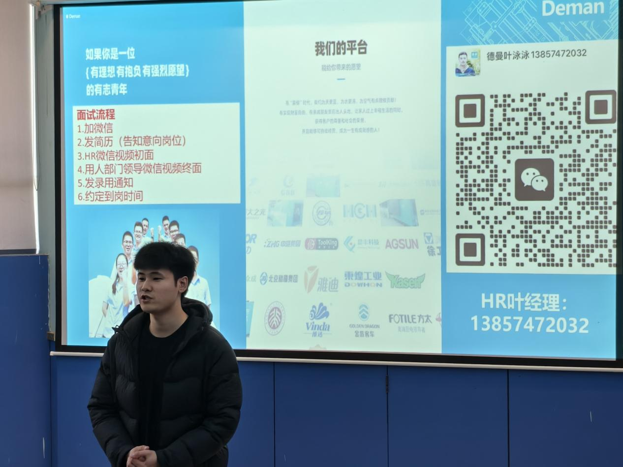 会后,宁波德曼压缩机有限公司在2号楼召开宣讲会,人力资源部叶经理、李鑫磊介绍了公司的发展历程、行业优势、岗位需求、员工成长与发展培养模式以及员工福利等内容。强调了该公司以“为天更蓝,为爱经营,为共同幸福”为经营使命,拓宽了学生的就业渠道。