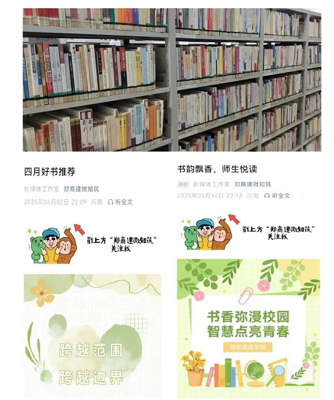 为激发师生的阅读热情,满足其个性化的阅读需求,学院在微信平台精心运营多个特色栏目。遵循一周一推、一月一推的原则,“每月好书推荐”栏目如知识的清泉,每月为师生推送10本涵盖专业知识、文学艺术、人文社科等领域的优质书籍,拓宽阅读视野;“书韵飘香,师生悦读”教师荐读栏目,18位教师结合专业与教学经验,分享蕴含深刻思想的好书,提供独特阅读视角;“书香凝班聚,逸韵伴读行”聚焦班级书香活动,6期精彩内容展现各班级阅读探索成果;“书香漫卷处,榜样引帆行”以6期阅读榜样报道,掀起“比学赶超”阅读热潮。这些线上栏目,持续为师生的阅读之旅注入活力。