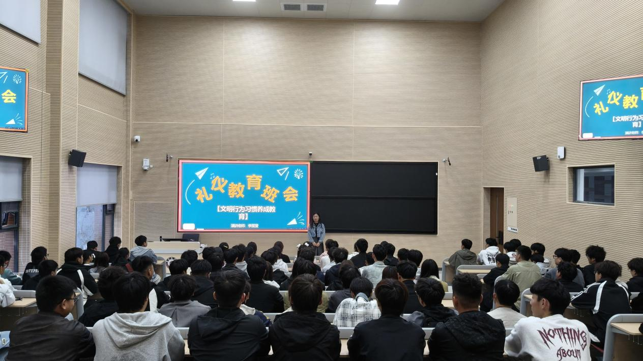 活动现场,新生辅导员老师以“礼仪教育班会” 为主题,从校园日常礼仪、人际交往礼仪、公共场合礼仪三大板块展开讲解。课堂上,老师结合校园场景案例,细致解读课堂出勤、食堂就餐、图书馆借阅等日常行为规范,比如 “进教室前轻声敲门”“就餐时按需取餐不浪费”“与师长交流时主动问好、站姿端正” 等细节,还通过图片对比,直观展示文明行为与不文明行为的差异,让新生清晰感知礼仪的重要性。