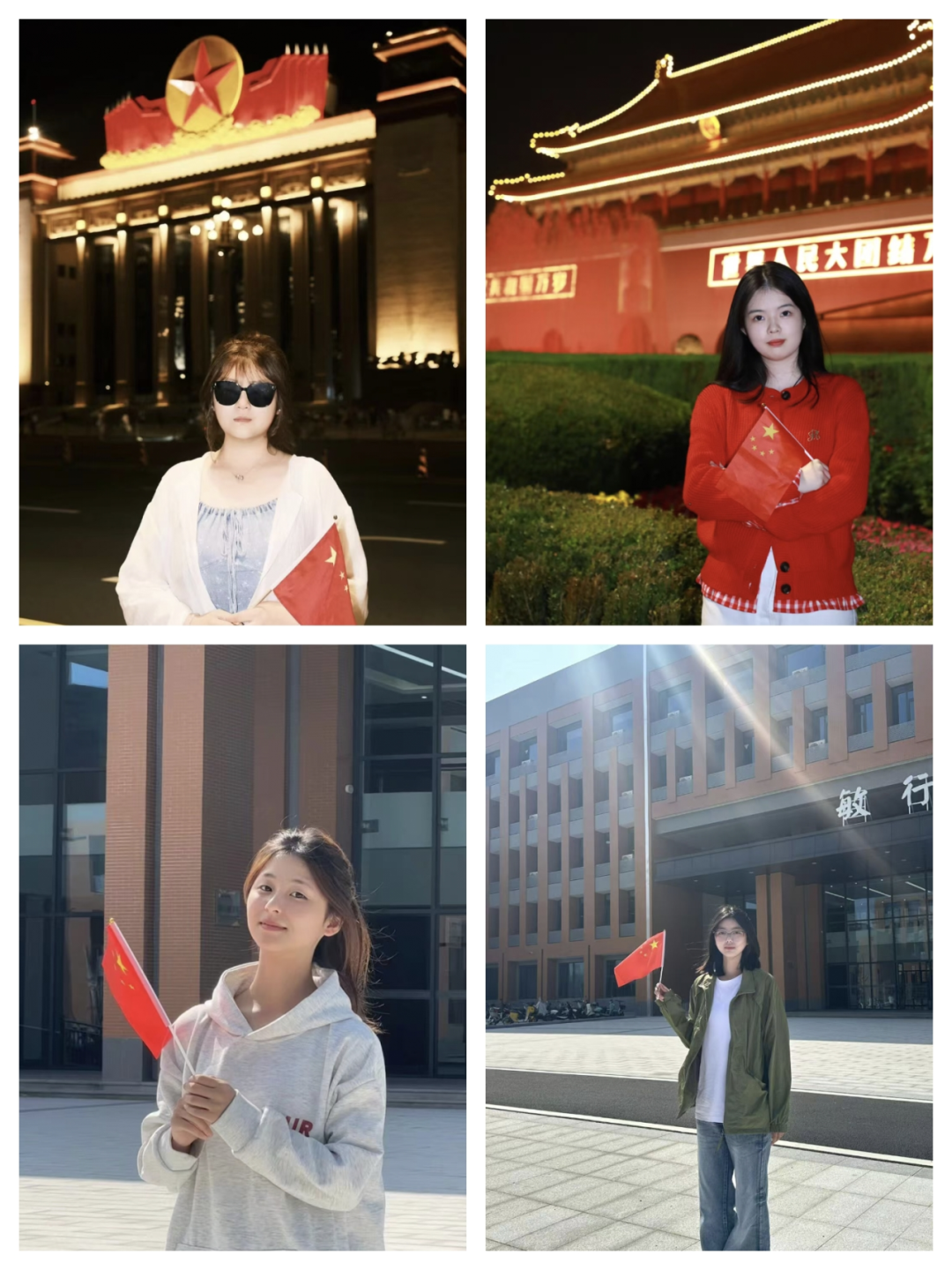 活动伊始,同学们有序前往敏行楼一楼大厅,郑重领取小国旗。这面鲜红的旗帜,是无数革命先烈用热血浸染的精神图腾,是国家主权与尊严的庄严象征,更是串联起全体中华儿女家国情怀的情感纽带。手持国旗,同学们迈步走过教学楼、成功大会堂、图书馆等校园标志性建筑,在每一处承载着学习与成长记忆的地方驻足,留下一张又一张珍贵合照。镜头之下,鲜红旗帜与灿烂笑容交相辉映;光影之中,满是全体学生对祖国最真挚、最深情的告白。