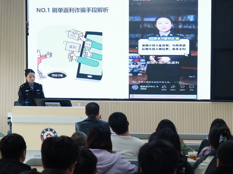 赵警官首先通过数据揭示电信诈骗案件的严峻性及其造成的巨大财产损失,随后聚焦教师群体,重点剖析数类高发骗局,并特别结合校园真实案例,针对“冒充老师收费”骗局,给出“建立多人确认机制”等务实防范建议。此外,还对最新虚假购物、网络交友等常见骗局进行警示。