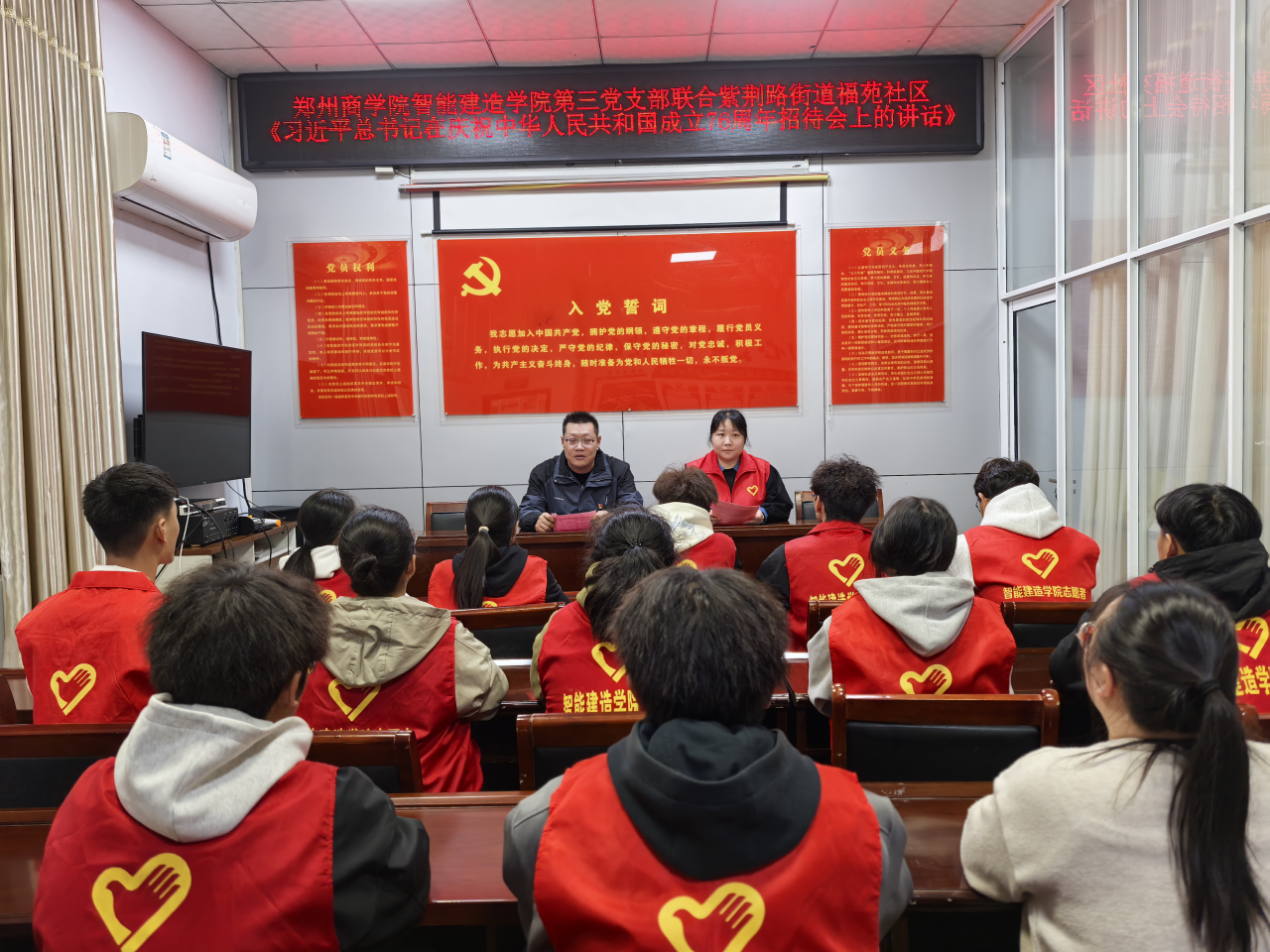 2025年10月16日,智能建造学院学生第三党支部联合巩义市紫荆路街道福苑社区党支部开展主题联学活动,组织师生党员与社区党员代表共同深入学习《习近平总书记在庆祝中华人民共和国成立76周年招待会上的讲话》,推动理论学习走深走实,凝聚校社共建发展合力。