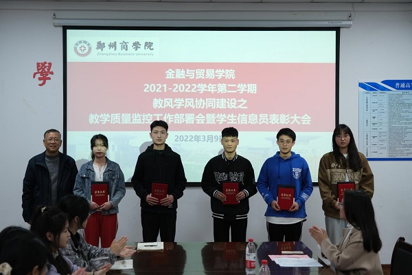 会上,首先吕书记宣读了《关于表彰2021-2022学年第一学期金贸学院“优秀学生监控信息员”的决定》,并由校督导员杨教授为宋安琪等5位优秀学生监控信息员颁奖。其次,优秀学生信息员代表宋安琪同学从如何搜集学生的反馈信息、如何履行信息员职责和工作的不足与改进三个方面分享自己的经验与体会。
