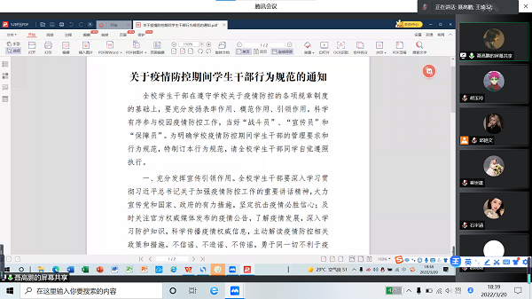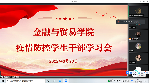 为加强落实学校疫情防控工作的相关要求,规范学生干部疫情防控时期的行为与意识,3月20日,我院组织召开线上疫情防控学生干部学习会,参加会议的有我院行政秘书兼团委书记杜尚远、学生干部代表,此次会议由聂高鹏同学主持。