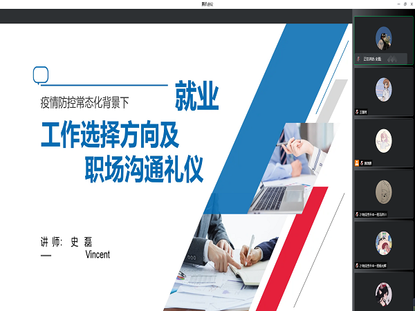 会议伊始,薛老师对史助理进行简单介绍,并表示热烈欢迎。接着,史助理为学生们带来《疫情防控常态化背景下高质量就业》专题讲座。在讲解中,史助理首先从社会、职业和行业环境三个方面进行工作选择方向分析,在复杂和激烈的竞争环境下希望同学们做好大学期间的总体规划,树立明确目标。其次,史助理从同事交往礼仪、与上司相处的礼仪、自身形象礼仪和电话礼仪四个方面向同学们分享职场技巧和礼仪要求,通过直观的案例和实际经验为同学们树立了良好的学习方向。最后,在疫情防控常态化的背景下,史助理嘱咐同学们要能够通过建立职业规划强化对自身职业发展的把握,清晰自己的奋斗目标。