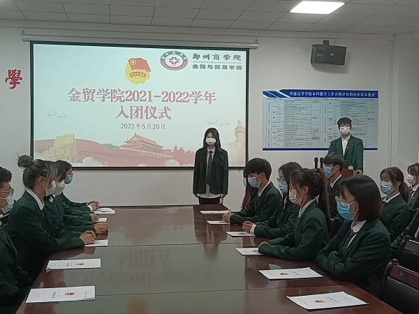 为迎接党的二十大胜利召开,深入贯彻落实习近平总书记在庆祝中国共青团成立100周年大会上的重要讲话精神,着力加强我院共青团队伍建设,增强青年进取意识,凝聚青春力量,5月20日下午,我院于一号教学楼110会议室召开以“铭记入团誓言,牢记青春使命”为主题的新团员入团仪式。金贸学院团委学生代表崔如梦、张嘉祎、张攀、张坤、余肇月、优秀团员代表以及15名新入团员参与此次仪式。