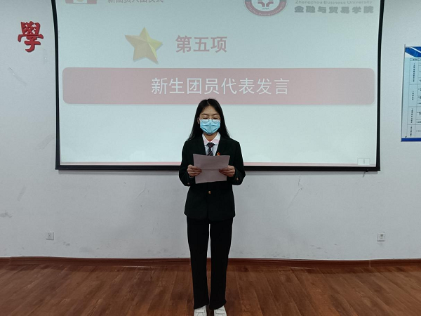 团委学生代表崔如梦同学对新团员的加入表示热烈祝贺,并对新团员提出了希望和要求,希望各位新团员努力学习,崇尚科学,追求真知,为团旗增色,为党旗增辉。