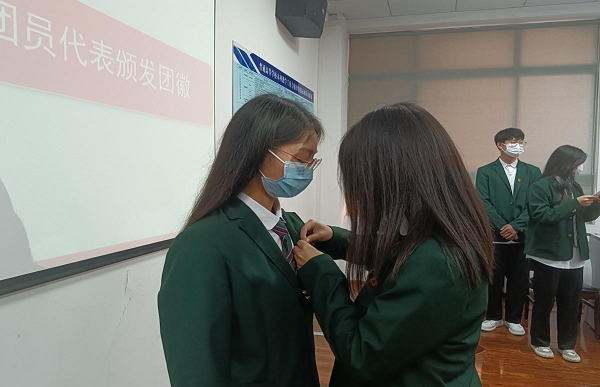 在庄严的国歌声中,入团仪式拉开帷幕。首先,由张嘉祎同学宣读15名新入团员名单,随后,团委学生代表崔如梦为新入团员颁发团员证,并由优秀团员代表周思雅为新入团员代表郭东慧佩戴团徽。