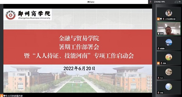 为保证我院暑期工作有序开展,积极响应“人人持证、技能河南”建设工作要求,6月20日下午,我院通过腾讯会议召开暑期工作部署会暨“人人持证、技能河南”专项工作启动会,会议由教学秘书胡乃峰主持,院长杨山峰、党委书记吕鹏、副院长李伟及我院全体教师、辅导员参加。