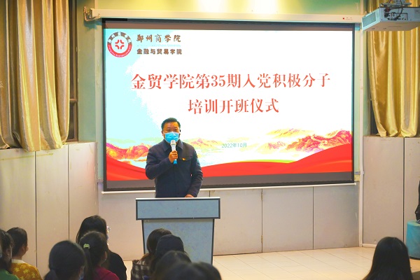 为进一步加强入党积极分子队伍建设,提高入党积极分子的思想政治素质和理论水平,10月13日,我院于1号楼101教室举行金贸学院第35期入党积极分子培训开班仪式。此次仪式由学院行政秘书兼团委书记吴森主持,学院党委书记吕鹏出席并发表讲话,各学生党支部书记、组织委员及本期入党积极分子共同参加。