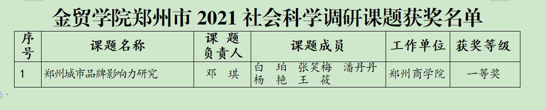 根据郑州市社会科学优秀成果评奖委员会的《关于郑州市2021年度社会科学调研课题表彰的决定》(郑社评字〔2022〕3号),我院1项郑州市2021年度社会科学调研课题获奖。望各位老师再接再厉,积极投身于科研工作中,取得更多科研突破。