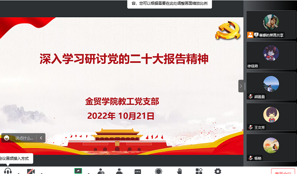 在自主学习的基础上,10月21日教工党支部通过腾讯会议集中学习研讨党的二十大会议精神。与会同志纷纷表示作为一名教育工作者,今后仍要持续学习、深刻领会党的二十大会议精神的思想精髓和核心要义,并努力把党的二十大会议精神融入到课堂教学中。同时,始终以二十大会议精神严格要求自己开展各项工作,始终坚持为党育人、为国育才,努力培养担当民族复兴大任的时代新人。