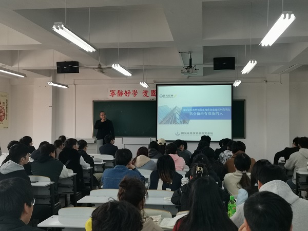 会议伊始,宋老师对国元证券股份有限公司郑州棉纺东路证券营业部的工作人员进行介绍,并表示热烈欢迎。接着,徐总监给学生们带来《机会留给有准备的人》专题讲座。徐总监主要从证券行业的前景和进入证券行业需要做哪些准备入手,结合自身经验将证券行业的前景娓娓道来,认为证券市场必然随着经济发展迎来更多机会;同时表明在校期间,学生应考取和本专业对口的相关资格证书,提高自身综合素质和专业能力,为今后就业打好坚实基础。其次,由我校优秀毕业生张旭伟、邓虎结合自身经历,对学弟学妹提出建议。他们从保持对行业的热爱、时刻保持自信、提前做好个人工作规划三个方面展开,希望学弟学妹们提升专业技能,做好知识储备。最后,蒋总做总结讲话,同时也向各位同学提出要脚踏实地、务实进取,提升自身综合素养。