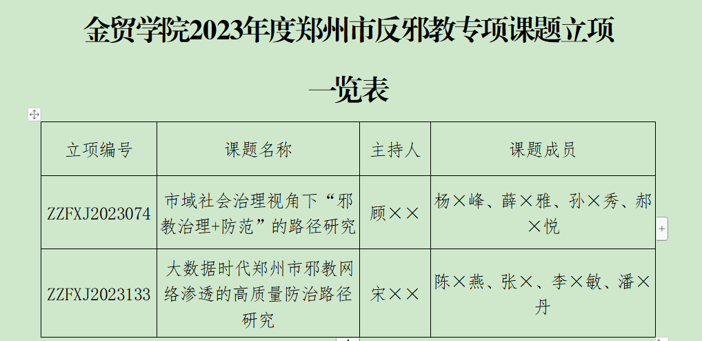 根据《郑州市社会科学界联合会、郑州市教育局、郑州市反邪教协会关于申报2023年度郑州市反邪教专项课题的通知》(郑社联字[2023〕1号)精神,经专家评审,我院2项2023年度郑州市反邪教专项课题获批立项。