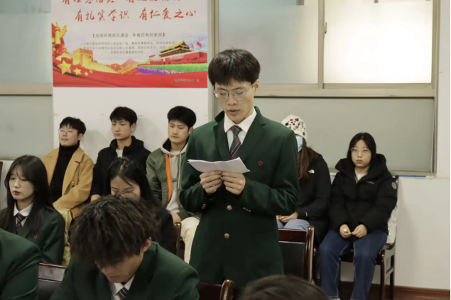 2023年12月12日,我院学生第三党支部于1号教学楼112召开支部预备党员转正暨接收大会,讨论陈怡怡、崔璎珞等22名同志预备党员转为正式党员的问题。会议由我院第三党支部书记赵丹阳、组织委员任哲蘅主持。