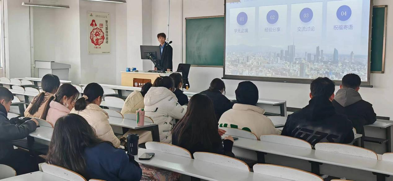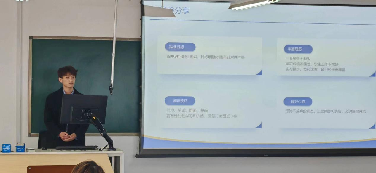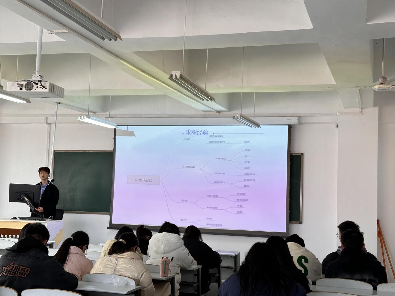 学长从学无止境、经验分享、交流讨论、祝福寄语四个方面进行交流分享。他勉励同学们在校期间应加强专业课学习,并通过亲身经历来强调学习的重要性。他结合自身求职经验,分享了找准目标、丰富经历、求职技巧、良好心态四方面具体方法。在交流讨论环节,在座同学积极提出问题,并得到了学长的有效回答。