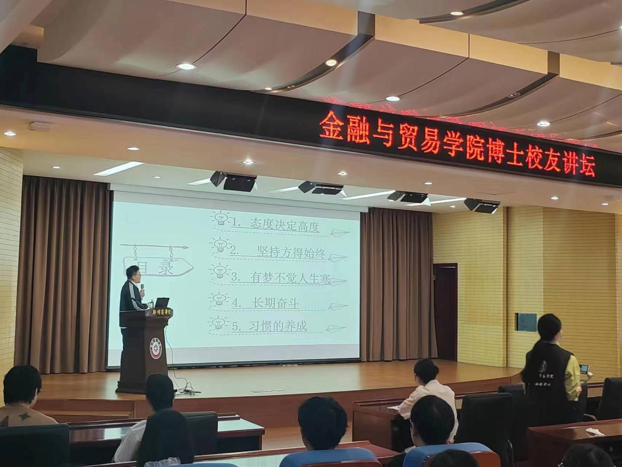 两秩芳华,岁次甲辰。为进一步帮助在校学生了解就业形势、明细未来发展方向,增进校友与母校情谊。我院于4月14日,由招生就业处主办、金贸学院承办的校友讲坛第二十期——“听校友学术奋斗路 励人生发展新起点”在图书馆五楼报告厅举行。在建校二十周年之际,我院特邀2009级毕业生,现中南财经政法大学经济学博士,河南师范大学硕士生导师李波副教授开展本次校友讲坛活动。
