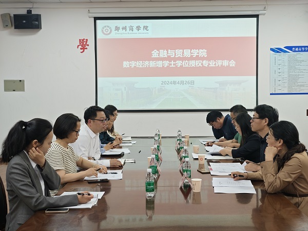 为做好学校新增学士学位授权专业审核,提高专业建设水平和人才培养质量,4月26日下午,我院在1号教学楼112会议室召开数字经济新增学士学位授权专业评审会。本次会议邀请了郑州大学商学院经济系主任沈琼教授,郑州大学商学院学科办主任牛树海教授,河南财经政法大学国际经济与贸易学院王彩霞教授,河南财经政法大学财政税务学院陈颂东教授及中原工学院国际贸易系主任郭利平教授五位专家。我院院长梁鹏、副院长贾孝魁、保险教研室主任曹娜及3位教师代表参加了此次会议,会议由梁鹏院长主持。
