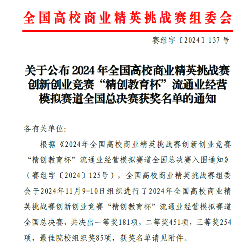 11月9-10日,由中国国际贸易促进委员会商业行业委员会、中国国际商会商业行业商会和中国商业经济学会联合主办的2024年全国高校商业精英挑战赛创新创业竞赛“精创教育杯”流通业经营模拟赛道总决赛在线举行。本次全国总决赛共有来自全国各地200余所院校参与,各参赛团队采用软件模拟经营的方式进行在线比拼,决出胜负,最终,共有47支团队获得了全国精英赛的参赛资格。我院物流管理专业学子组成的两支代表队凭借总决赛的出色表现,同时荣获“全国一等奖”,我校荣获最佳院校组织奖。其中,22级学生史耀雨、支建豪等所在的“包赢小队”斩获第一名,成功晋级全国精英赛,将在11月29日-12月1日展开线下冠军争夺赛。