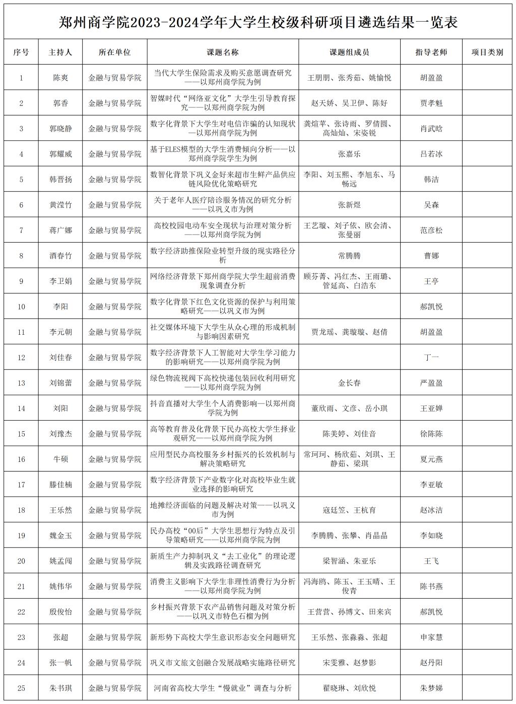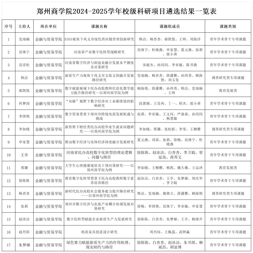 依据学校关于2024-2025学年校级科研项目申报分配的指标限额,经金贸学院教指委评选,院长审议,从提交的19项校级科研项目和38项大学生科研项目申报书中遴选17项校级科研项目和25项大学生科研项目,现将结果进行公示(详见附件)。