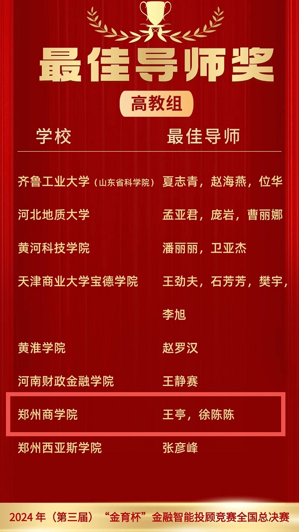 11月23日,由中国人民银行旗下的《当代金融家》杂志社主办,由金智东博(北京)教育科技股份有限公司承办的2024年“金育杯”金融智能投顾大赛在线上举行,共有100多所高校的218支队伍在决赛中竞技。经过激烈角逐,我院投资学专业李昊峻、朱宇晴、李炫坤、王佳慧四位学生组成的“赛博小子”参赛团队荣获高教组一等奖。王亭、徐陈陈两位指导老师获得“最佳指导老师奖”。