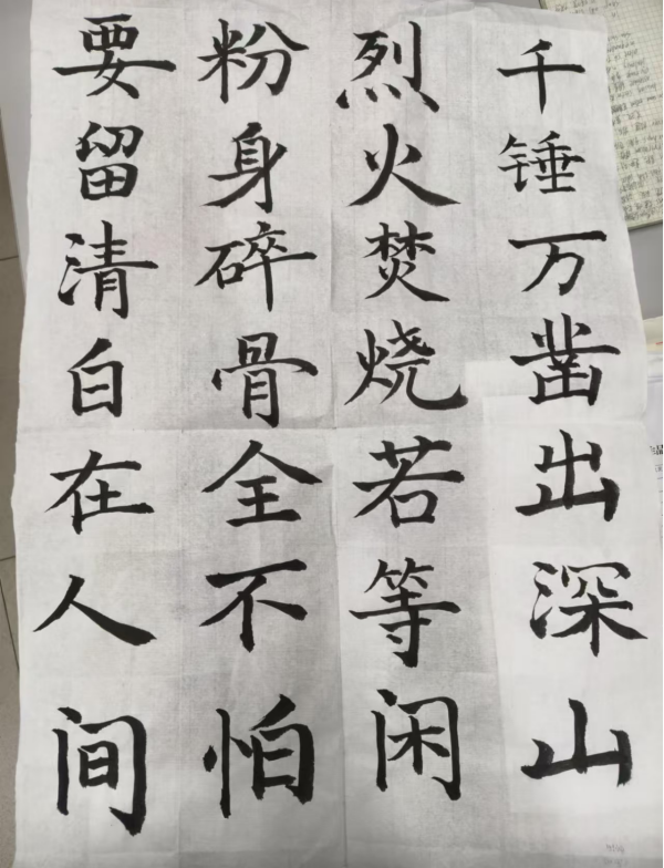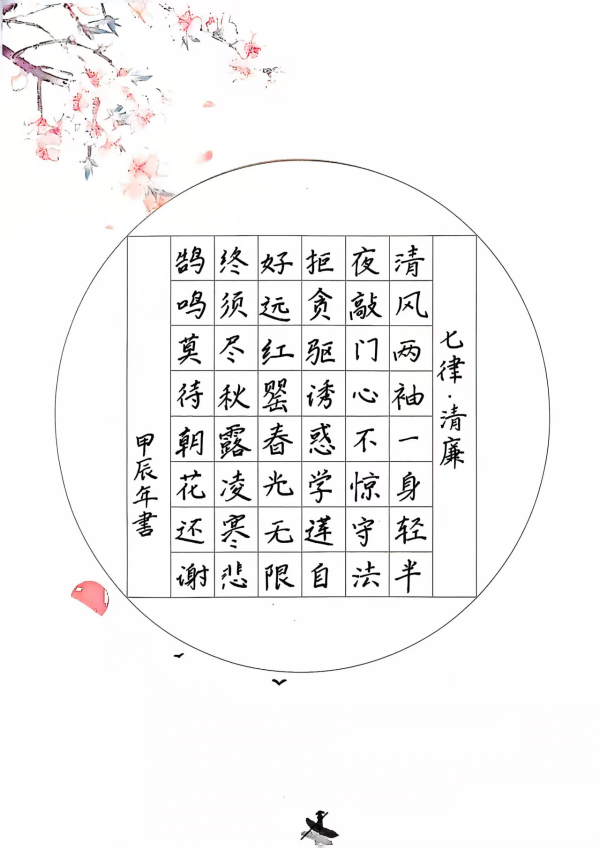 作品简介:这幅书法字体端正,笔画刚劲有力,体现出一种浩然正气,与诗中的廉洁精神相得益彰。通过书写这首诗,不仅展示了书法技艺,更传达了对廉洁品质的尊崇和追求。这种将文学与书法相结合的方式,在欣赏艺术的同时,也弘扬了廉洁文化。