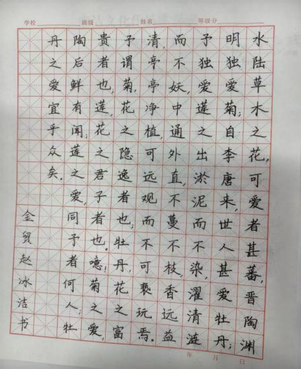 作品简介:这是一幅以《爱莲说》为内容的书法作品,作品以工整的字迹呈现,体现了作者对《爱莲说》所传达的廉洁思想的敬重。这种将经典文学与书法艺术相结合的方式,不仅展示了书法之美,更在潜移默化中传播了廉洁奉公、坚守自我的价值观,具有很强的教育意义。