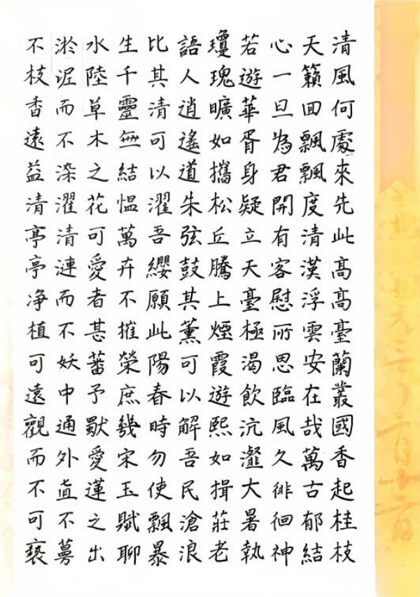 作品简介:这幅作品字体工整,笔法有力,文中出现了许多与廉洁相关的语句,如“心清”“清灵”“清涟”等,这些词语都体现了廉洁奉公、清正廉洁的价值观。这幅书法作品不仅在艺术上有一定的造诣,更在内容上传递了廉洁的理念,具有启发意义。