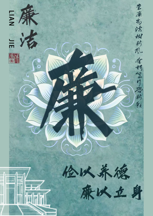 作品简介:这是一张以廉洁为主题的海报。海报的背景颜色为淡绿色,中央位置有一个大大的“廉”字,字体刚劲有力,凸显了主题。“廉”字的周围装饰有莲花图案,莲花象征着纯洁,与廉洁的主题相得益彰。