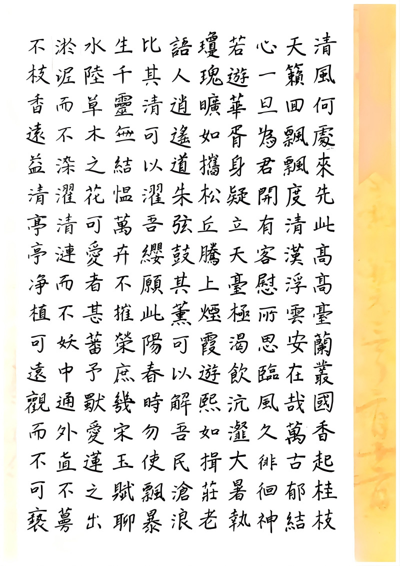 作品简介:这幅作品字体工整,笔法有力,文中出现了许多与廉洁相关的语句,如“心清”“清灵”“清涟”等,这些词语都体现了廉洁奉公、清正廉洁的价值观。这幅书法作品不仅在艺术上有一定的造诣,更在内容上传递了廉洁的理念,具有启发意义。