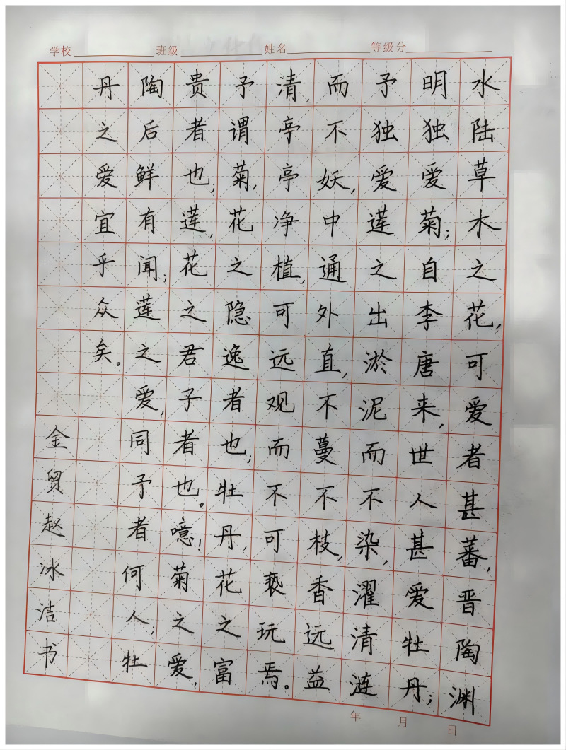 作品简介:这是一幅以《爱莲说》为内容的书法作品,作品以工整的字迹呈现,体现了作者对《爱莲说》所传达的廉洁思想的敬重。这种将经典文学与书法艺术相结合的方式,不仅展示了书法之美,更在潜移默化中传播了廉洁奉公、坚守自我的价值观,具有很强的教育意义。