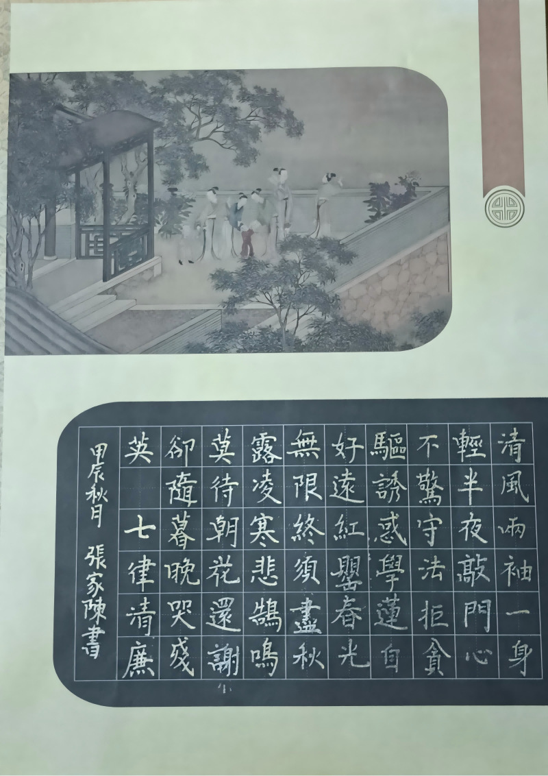 作品简介:这幅作品分为上下两部分。上部分是一幅描绘古代庭院场景的图画,画中有几个人物在庭院中活动,周围有树木和亭子,营造出一种宁静的氛围。下部分是一篇书法作品,字体工整,内容为一首诗。诗中提到“英律清”“暮哭残”“朝花还”等词句,传达出一种对时光流逝和自然景象的感慨。整体作品结合了绘画与书法,展现出传统文化的韵味。