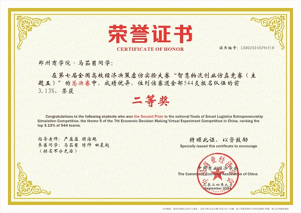 9月8日,由中国商业经济学会主办、广西财经学院、广西商业经济学会、广西高校经济学与财政金融学类教学指导委员会共同承办的第七届全国高校经济决策虚仿实验大赛“智慧物流创业仿真竞赛(主题五)”。此次大赛共544支队伍、1632名选手同台竞技,我院物流管理专业学子组成的“一路顺风”队在激烈的角逐中脱颖而出,位列该赛道全部544支报名队伍的前3.13%,取得全国第17名好成绩,荣获“第七届全国高校经济决策虚仿实验大赛“智慧物流创业仿真竞赛(主题五)”二等奖,我院物流管理教研室主任严盈盈和教师顾海艳荣获“优秀指导老师”奖。
