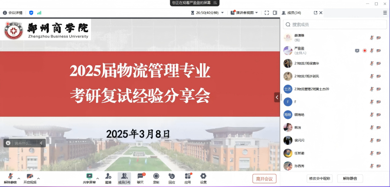 为助力考研学子掌握复试技巧,顺利通过复试,圆梦理想学府,3月8日,我院物流教研室借助线上腾讯会议平台举办了一场考研复试经验分享会。本次分享会邀请2020级物流管理专业优秀毕业生马林林学姐、潘璐学姐进行分享,2025届物流管理考研上线学生及指导老师参加,由物流管理教研室主任严盈盈老师主持。