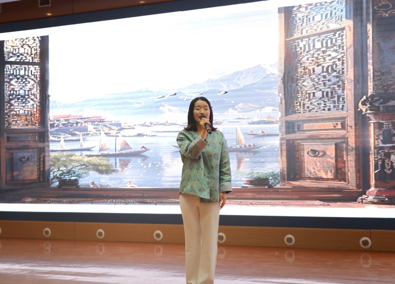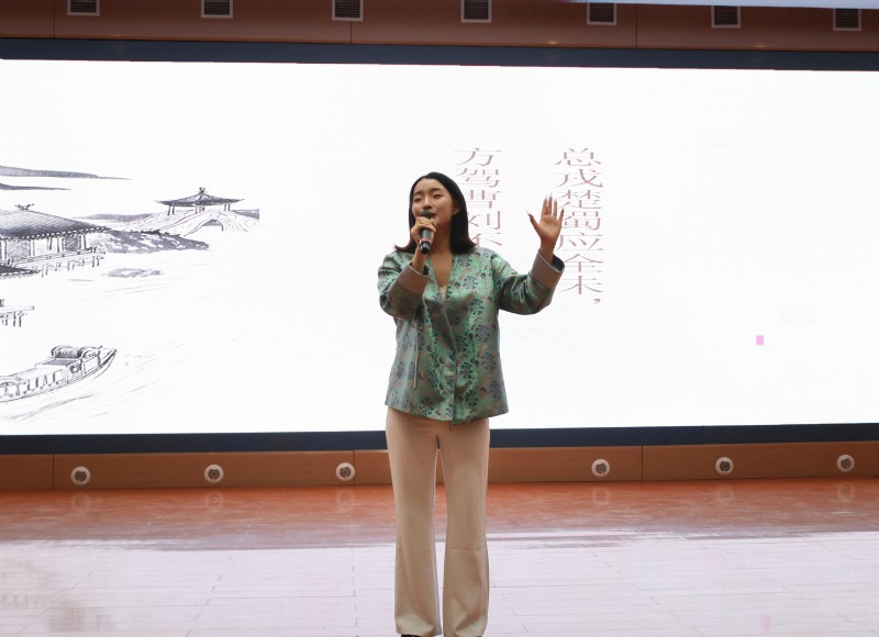 在“经典传诵”环节,24国贸2班张卓化身诗词使者,运用多元艺术形式,将杜甫《绝句》的诗韵之美展现得淋漓尽致。舞台灯光渐亮,悠扬舒缓的古典配乐缓缓流淌,她身着典雅的传统服饰,以饱含深情的语调徐徐展开吟诵。她凭借对诗歌韵律的精准把握,结合配乐的巧妙烘托,让经典诗篇在舞台上焕发新生,将《绝句》中清新明丽的自然之美与深沉含蓄的家国情怀,传递给了现场每一位观众。